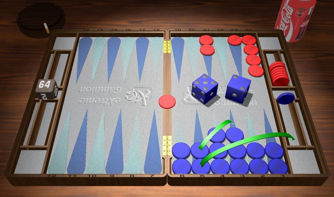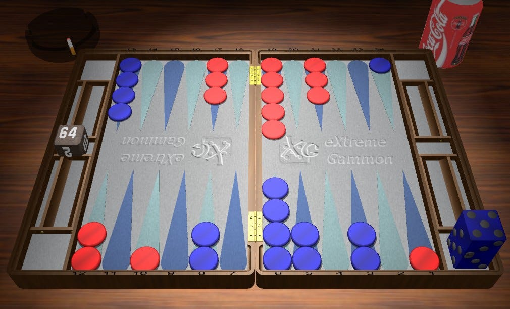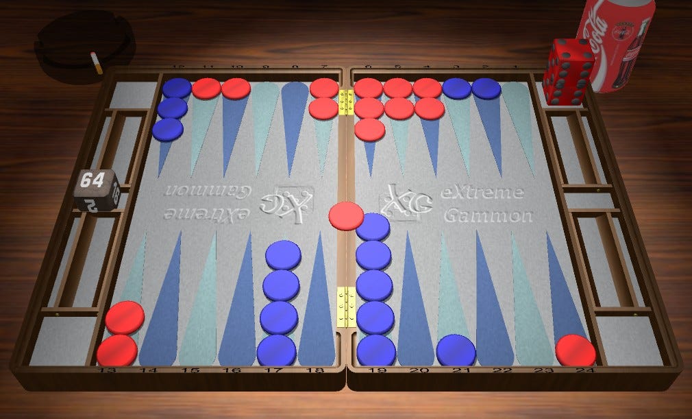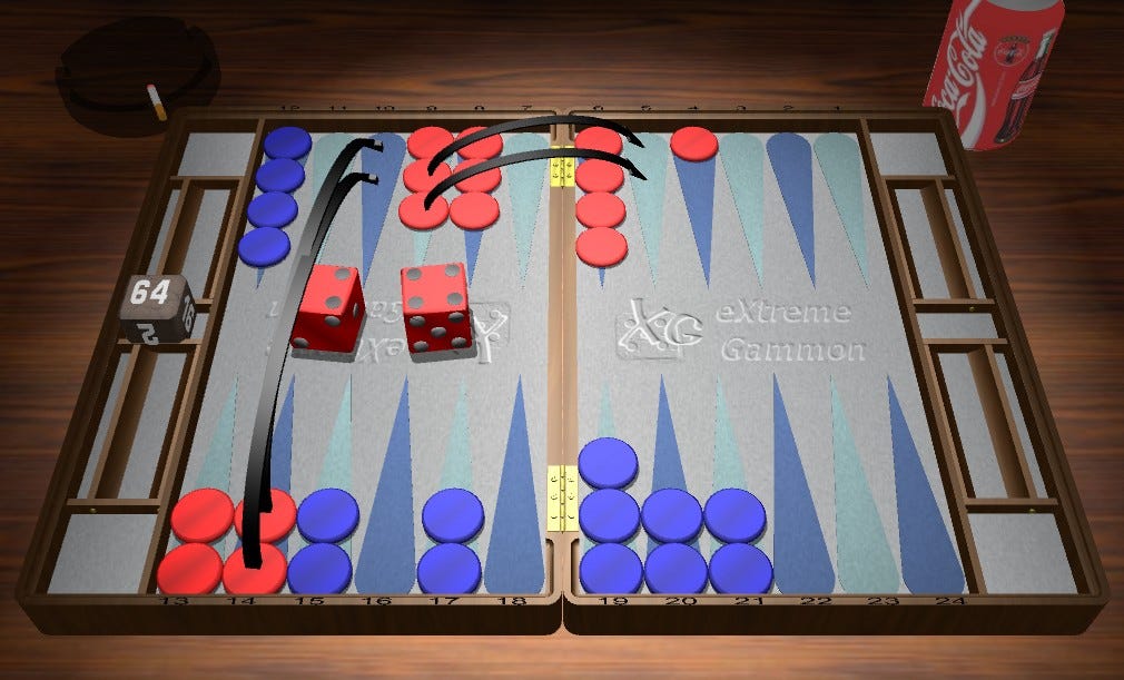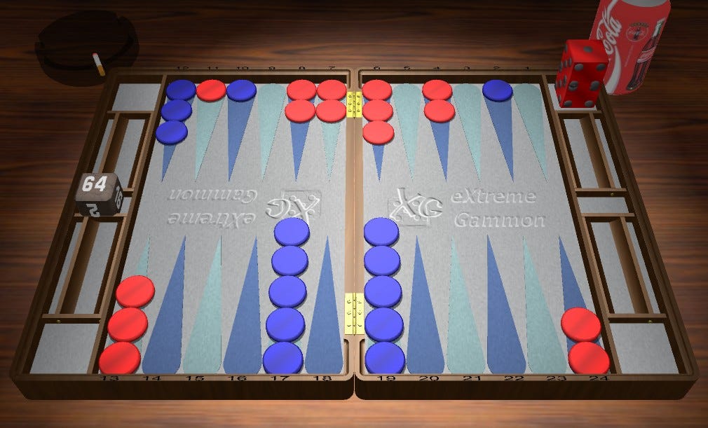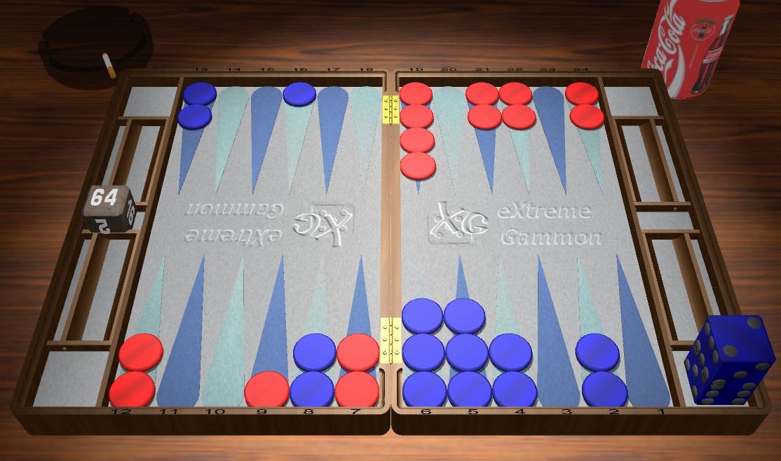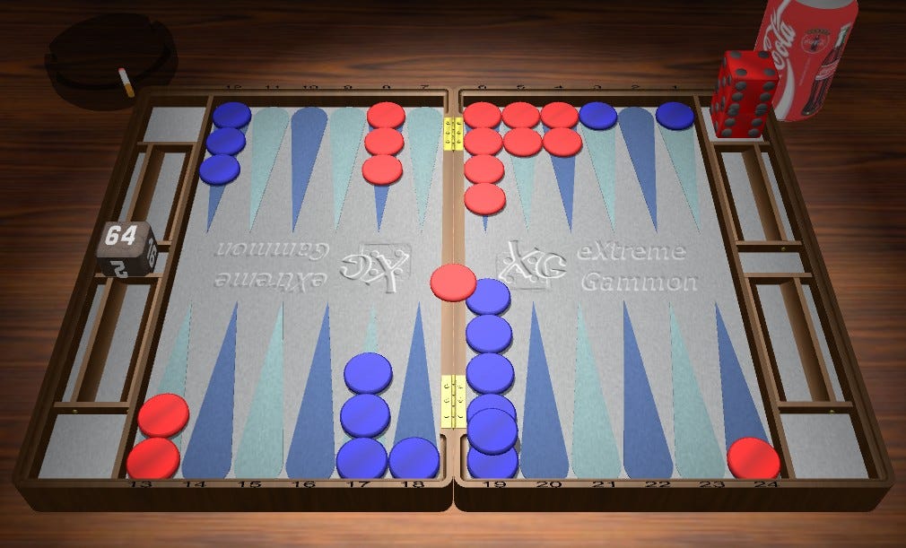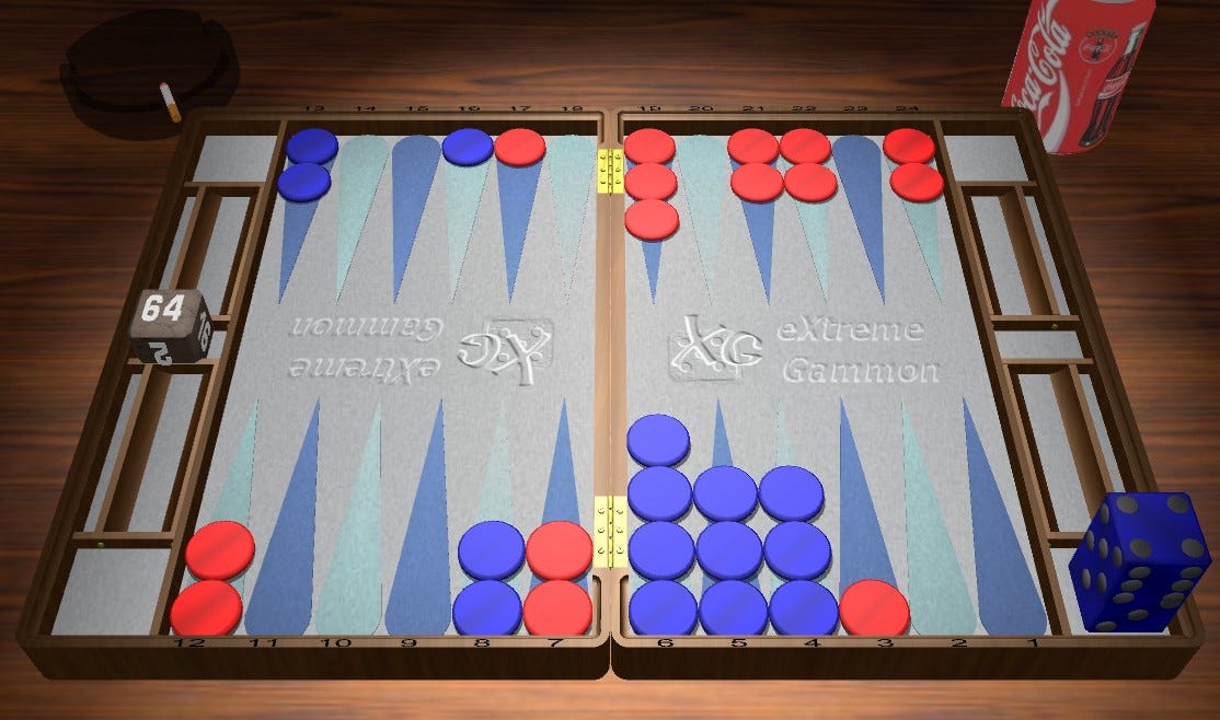 Red rolls 54 - 13/4 . (62.0%/19.6%/11.5% - ++) Both players are in a bit of a standoff to see who will activate their back checkers first, with Blue holding the upperhand structurally.