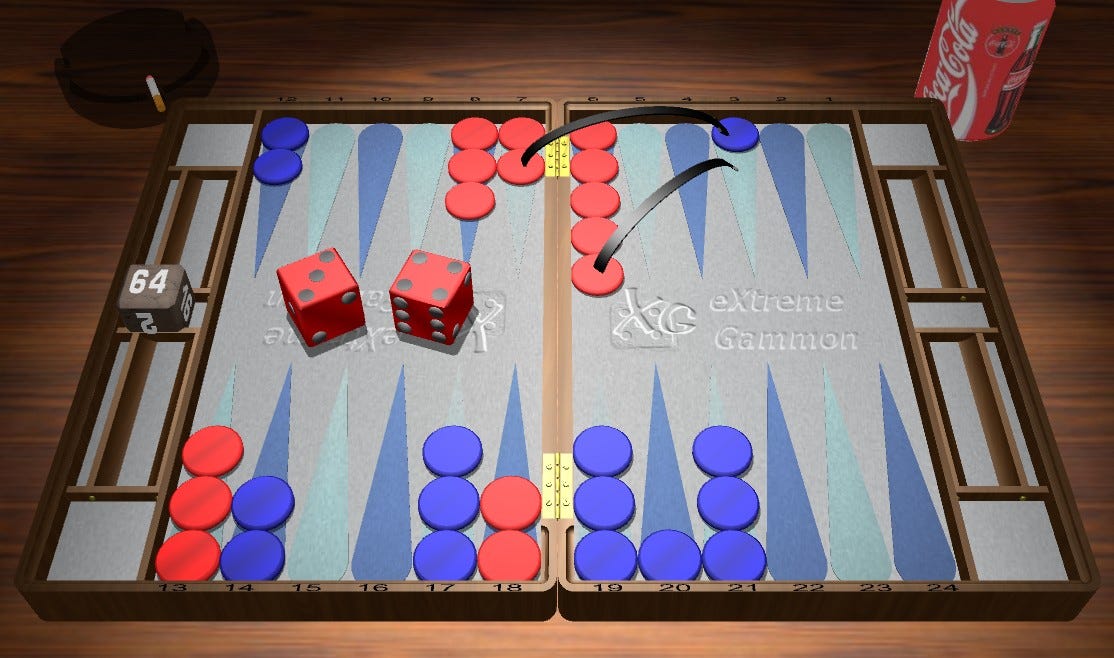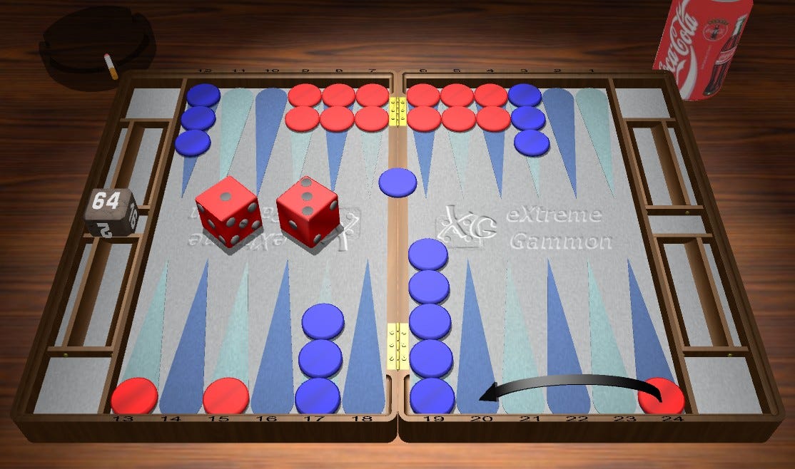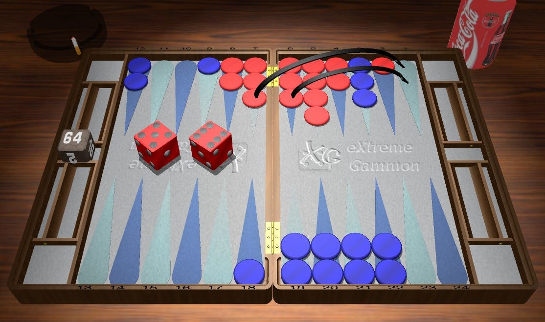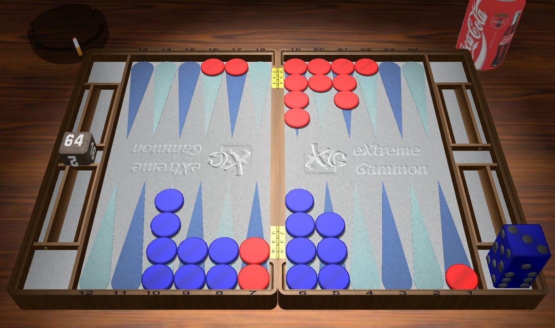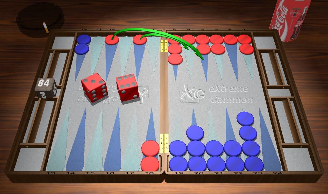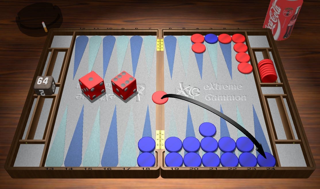 Red rolls 44 - 24/20 (2), 13/9 (2) (44.1%/5.4%/11.7% - ++). Red responds by anchoring and eliminates the majority of Blue’s gammons. It’s now critical for Blue to either anchor or escape its outfield checker.