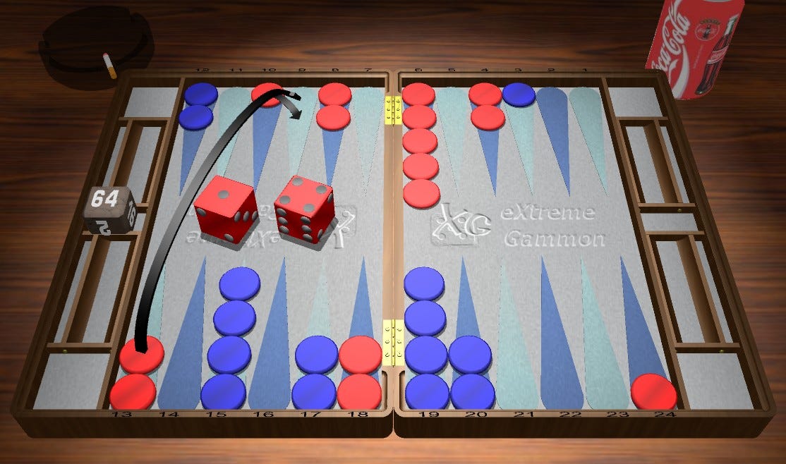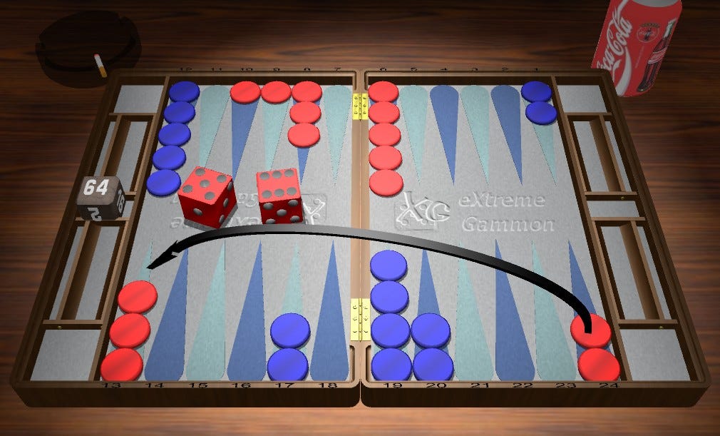 Blue rolls 62 - 24/18, 13/11 (50.7%/13.4%/14.1% - Rollout of 46,656 games) Blue opens by splitting with 62.