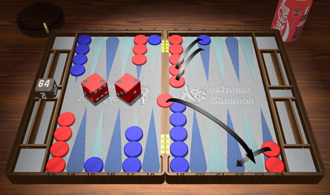 Blue rolls 65 - 24/13 . (63.7%/17.3%/9.7% - ++) Blue escapes a checker first! And look at what it does to both players’ gammons