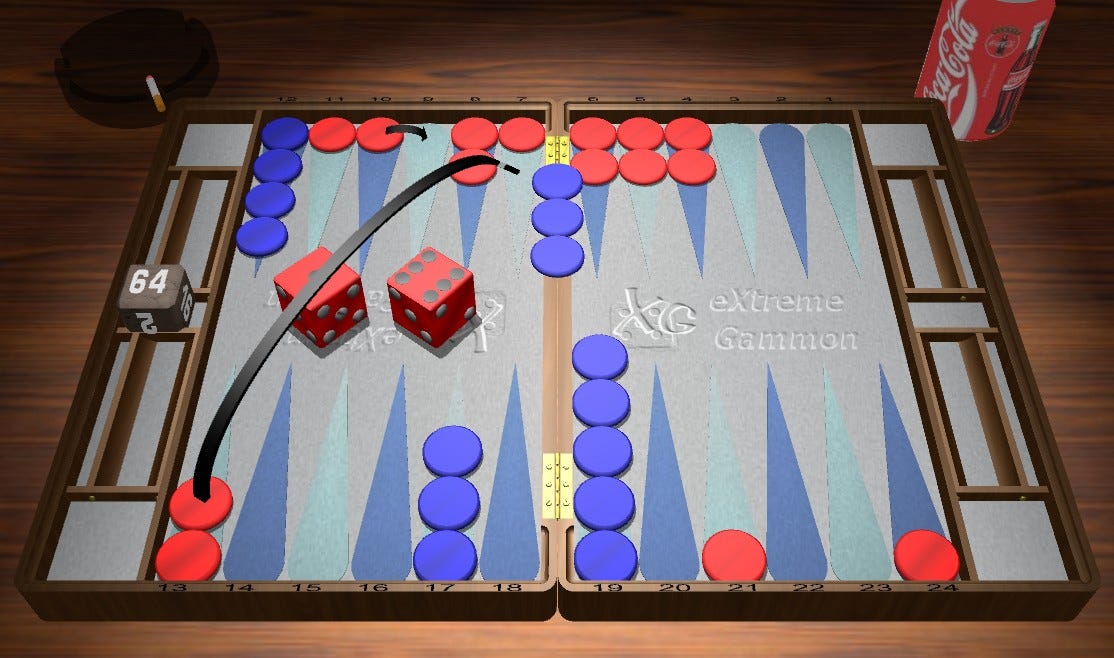 It turns out that this is the second best play. Not by much (-.023), but by enough that it is worth taking a closer look particularly because it seems like such an obvious play. Here’s the preferred checker play: